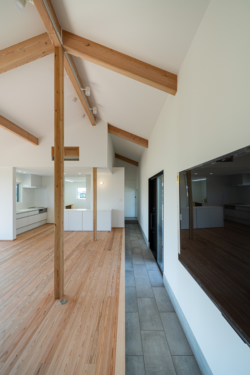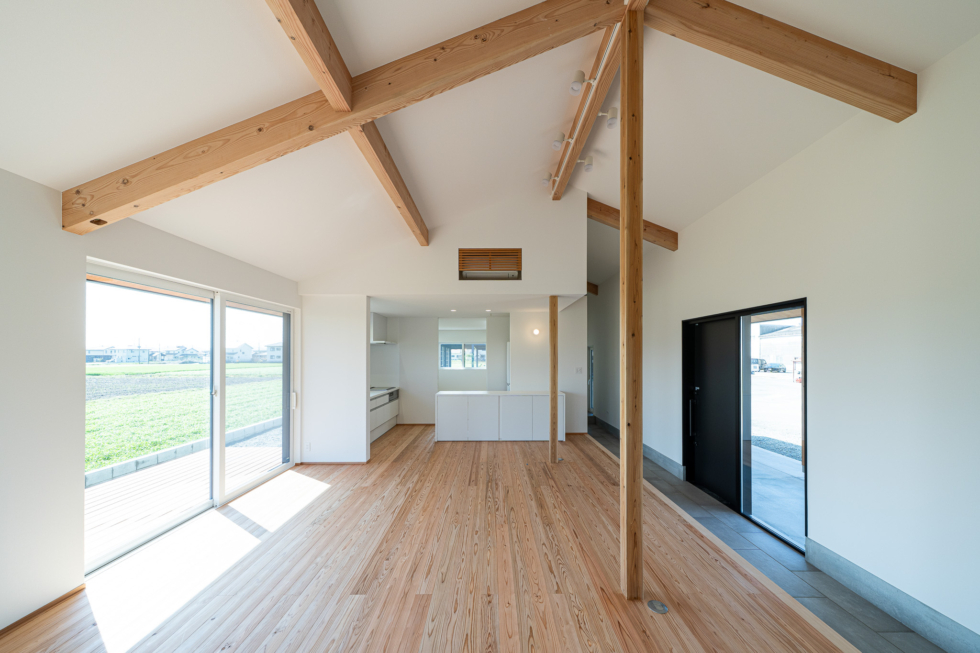 土間からの視線を意識し、登り梁を見せることで、構造の重なりが際立つ美しい意匠に仕上げました。