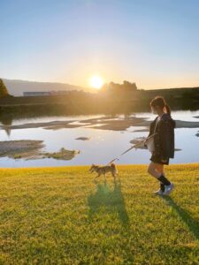 ダッシュで走り回り、河川敷を駆け上がる犬…にいつも引っ張れてます笑